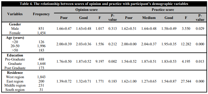 An analysis by ANOVA revealed no difference effect statically between the score of the Libyan people's opinion towards ban measures of COVID-19 by authorities and gender (P = 0.313), age (P = 0.212), and residence (P = 0.183), while education had a statistically significant effect (P = 0.002) as shown in Table 4. The practice score of the Libyans showed a significant difference with gender (P =0.029), age (P = 0.000), education (P = 0.013) and residence (P = 0.000).