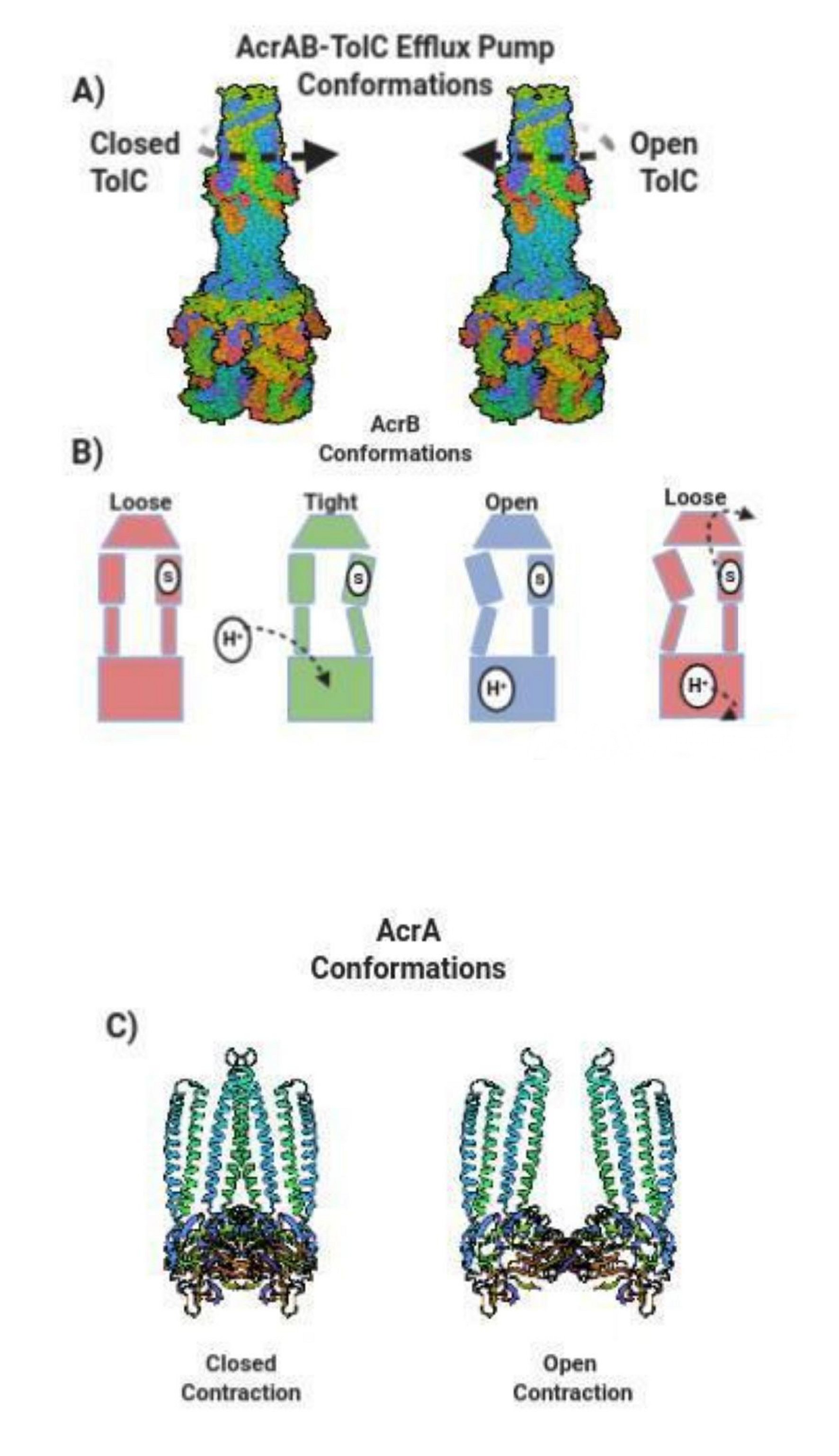 a) TolC rotates counterclockwise and clockwise. Counter clockwise closes the TolC channel while clockwise rotation opens TolC. (b) AcrB conformations include loose, tight, and open orientations. A drug substrate (s) enters the initial loose form of AcrB and then changes into a tight position after a hydrogen proton enters AcrB. AcrB alters into an open adjustment and then returns to a loose assort-ment that forcefully exports the drug substrate. (c) AcrA contracts in a closed state and loosens with an opened contraction.