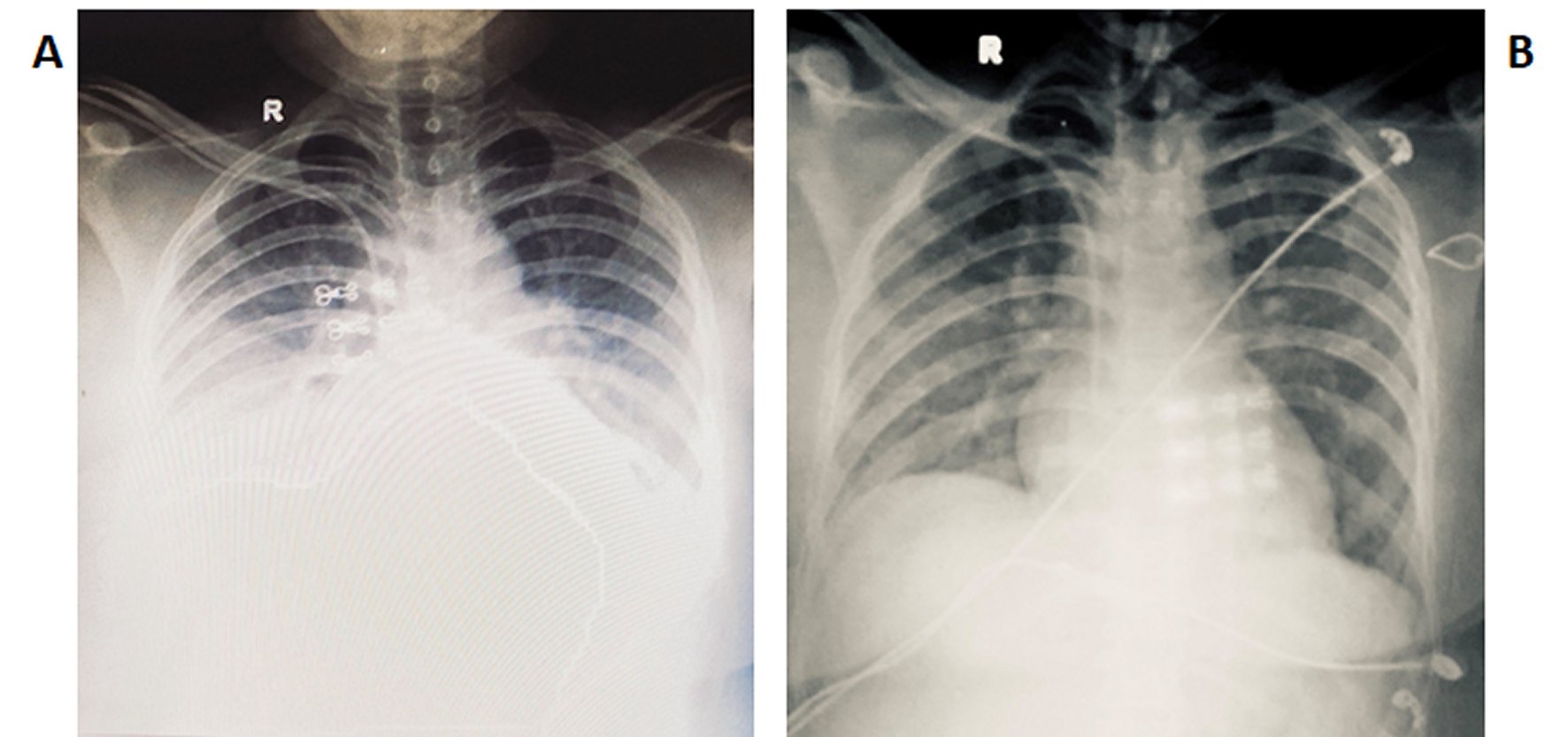 On day 3 of admission, she developed shortness of breath and oxygen saturation started falling. She was hooked with an oxygen mask at oxygen at 8L/min. Immediate chest X-ray showed left lower zone consolidation (Figure 1A) for which antibiotic and steroid were added. Piperacillin/Tazobactem at 4.5g every 8hourly was continued for 7 days. 200mg of intavenous hydrocortisone was given stat and then 100mg every 8 hourly was continued for 7days. She required oxygen for the next 36 hours and we were able to gradually taper off the oxygen requirement. She was completely stable on day 4 of admission to the ICU and magnesium sulfate infusion was continued for 5 days.