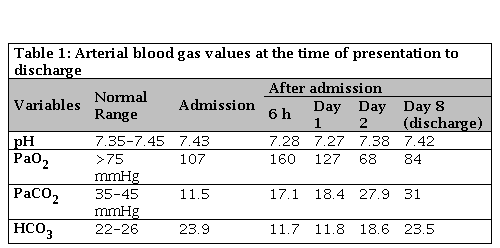 Six hours after the admission to Intensive Care Unit (ICU), the patient developed hypotension (BP=70/50 mmHg). She was resuscitated with one litre of normal saline and the blood pressure after one hour was 80/60 mmHg. Nor-adrenaline drip was started at 0.05mcg/kg/min and increased upto 0.1mcg/kg/min until the blood pressure returned to a normal range. Arterial blood gas (ABG) analysis showed metabolic acidosis (pH: 7.28, PaCO2: 17.1, HCO3: 11.7) for which sodium bicarbonate infusion was given over the next 48 hours until the acidosis was corrected. The ABG was repeated at every 24 hour until the acidosis was normalized (Arterial Blood Gas report from admission to discharge shown in Table 1).
