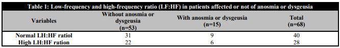 No association was found (p=NS) between the presence of anosmia or dysgeusia and a high LF:HF ratio (greater than 2) (Table 1).