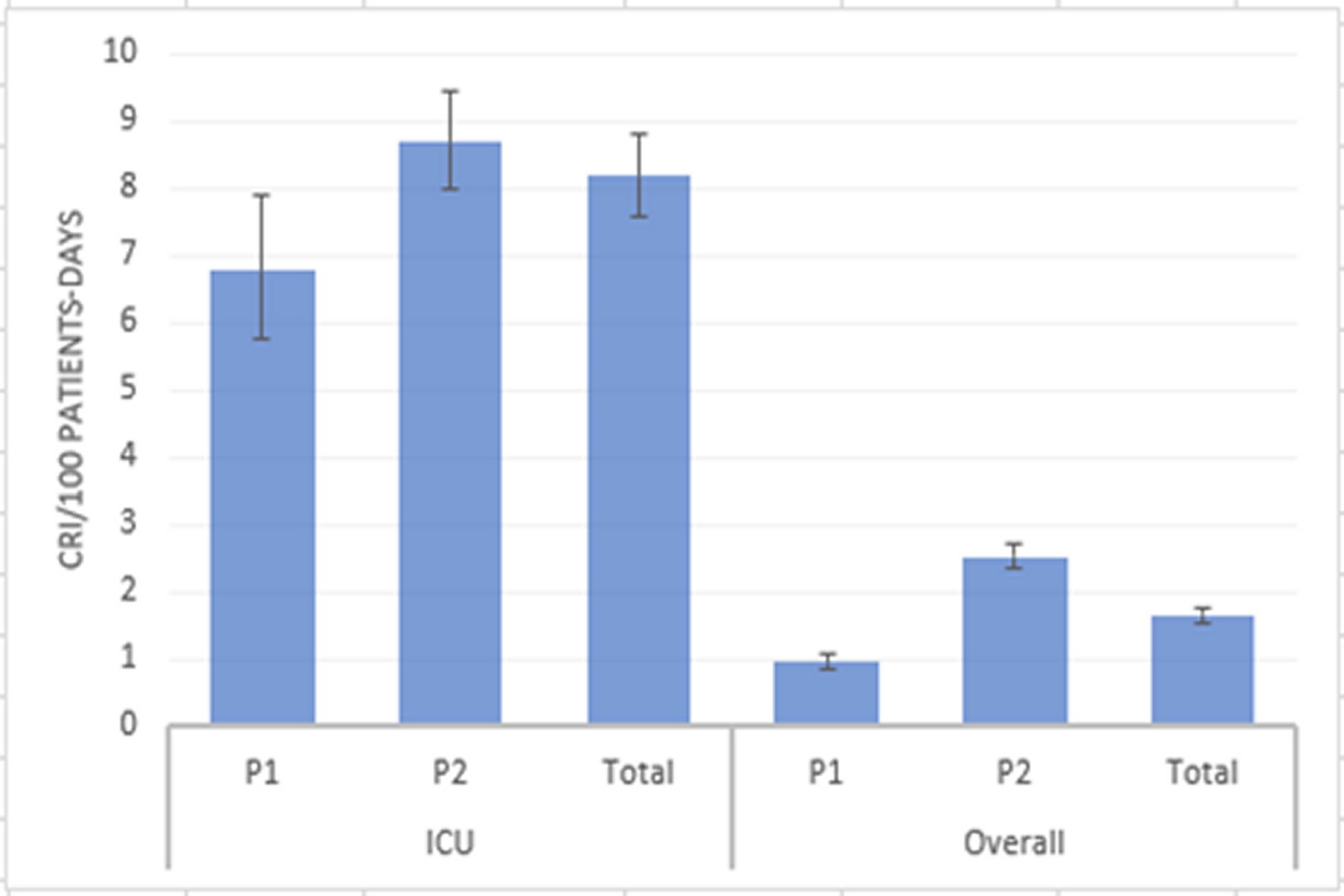 Indeed, we found a 2.5 times increase in CRI incidence overall, at the expense of ICU patients, who not only had longer in-hospital stays but also doubled in number in P2.