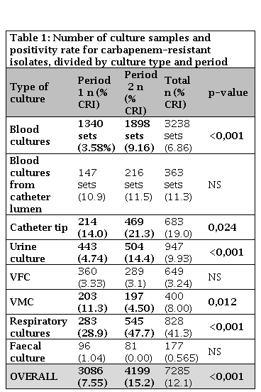 Overall blood cultures positivity to CRI rose from 3.58% to 9.16% (p<0,001), urine culture positivity from 4.7% to 14.4% (p<0,001) and respiratory samples culture from 28.9% to 47.7% (p<0,001). Other changes in positivity rates are shown in Table 1.
