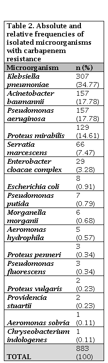 Results: 9,135 hospitalizations, 50,145 patient-days of analysis. 7,285 clinical samples were taken, with an overall positivity for carbapenem-resistant isolates of 12.1% (n=883). Overall carbapenem-resistant isolates incidence during Period 2 was 2.5 times higher than in Period 1 (2.52 vs 0.955/100 patient-days, p<0.001). Intensive Care Units’ carbapenem-resistant isolates incidence raised from 6.78 to 8.69/100 patient-days in Period 2 (p=0.006).