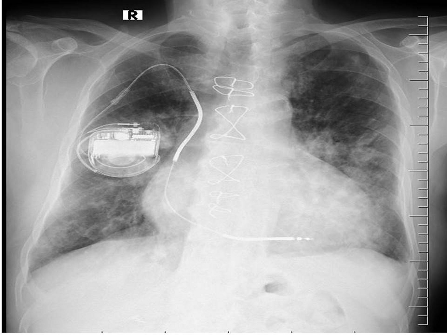 The patient was hospitalized for further examination with a prediagnosis of IE. Since the patient did not have a clear focus of infection (he had no signs of pneumonia, urinary tract infection, etc., and other viral-zoonotic infections), IE was considered as a preliminary diagnosis because he only had a CIED as a risk factor. Initial laboratory studies showed a white blood count of 18.9 x 109/L, a haemoglobin level of 12.4 g/dL and a platelet count of 192,100 /L. Urine analysis was showed 2+ blood, protein 1+. Biochemical blood analysis showed: normal electrolytes, liver and kidney function test and C reactive protein (CRP) at 10.4 mg/dl. There was no serological test results for HIV, HBV, HCV, CMV or EBV infection. A chest X-ray had bilateral basal infiltration and intracardiac device (ICD) (Figure 1). Ceftriaxone 1x2 g/day intravenous (i.v.) was begun empirically after six bottles of blood cultures were obtained. The blood culture samples incubated to BACTEC 9240 (Becton Dickinson Instrument System, Sparks, USA) and in six of them Corynebacterium spp. grew up. Phoenix100™ performed identification of the microorganism (Becton Dickinson Instrument System, Sparks, USA). The antibiotic susceptibility of the microorganism was determined be sensitive to vancomycin and linezolid, and resistance to cephalosporins, penicillin, ciprofloxacin, tetracycline, meropenem, and clindamycin. Accordingly, ceftriaxone was stopped and vancomycin 1x2 g/day i.v. was started. The patient was consulted with cardiologist again with a prediagnosis of IE for trans-oesophageal echocardiography (TEE). The TEE revealed 0.9 mm dimensions mobile vegetation on the tricuspid valve anterior leaflet. After 72 hours of the treatment, surveillance blood cultures did not return negative. The CIED was removed and sent for culture and sensitivity. The same bacterial growth was obtained. After the removal of the CIED, the blood culture turned negative.