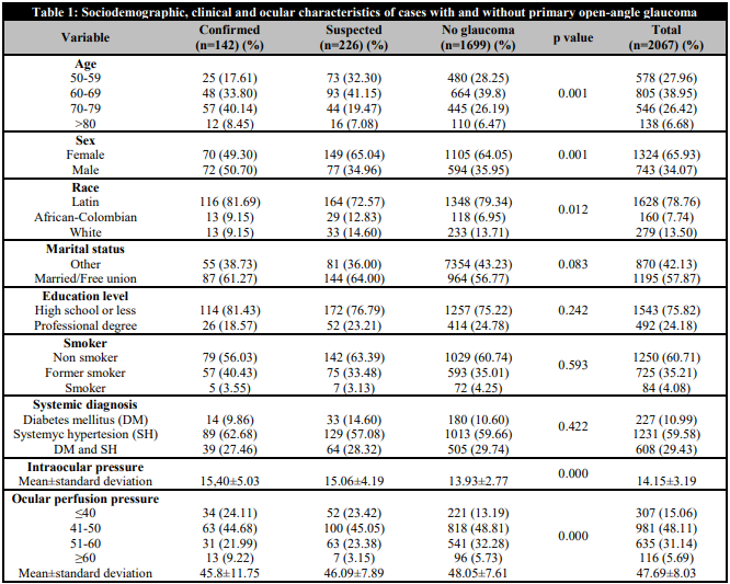 Material and methods: A cross-sectional study was conducted in Colombia among hypertensive and diabetic patients. This study included 2,067 subjects older than 50 years who were attended by a group of ophthalmologists in six cities in Colombia who conducted a complete medical and ophthalmological examination and applied standardized questionnaires and interviews aiming to evaluate participant’s health conditions and lifestyles.
