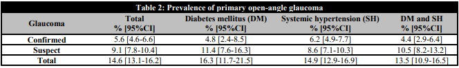 The Prevalence of confirmed POAG was 5.6% [95%CI: 4.6-6.0], with a higher prevalence observed among those with SH only (Table 2).