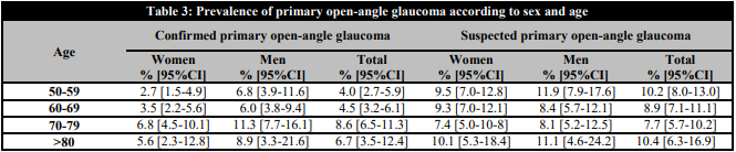 The proportion of suspected cases was higher among participants with DM. The prevalence of POAG according to age and sex is described in Table 3. Confirmed POAG was more frequent in men of all ages. The prevalence of Optic disc hemorrhage (ODH) was 0.4%, 50% of patients with ODH had a diagnosis of POAG, and 50% of patients with ODH did not have glaucoma.