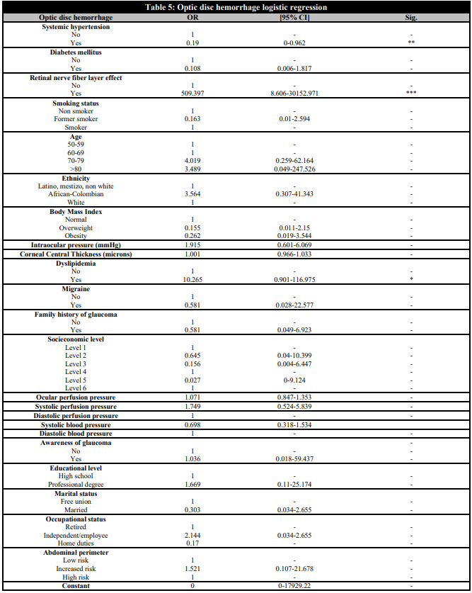 In multivariate logistic analysis (Optic Disc Hemorrhage as a response variable), the explanatory variables taken into account were: SH, DM, Retinal Nerve Fiber Layer Defect, smoking, age, sex, ethnicity, BMI, IOP, Central Corneal Thickness, Dyslipidemia, Migraine, Family history of Glaucoma, socioeconomic status, Ocular Perfusion Pressure, Systolic Perfusion Pressure, Diastolic Perfusion Pressure, Systolic Pressure, Diastolic Pressure, Self Diagnosis of Glaucoma, education level, marital status, occupation, and Abdominal Perimeter. Patients with a diagnosis of SH had an OR of 0.02 (95% CI 0.00 - 0.96); also, patients with Retinal Nerve Fiber Layer Defect presented an OR of 509.40 (95% CI 8.60 - 30152.97) (Table 5).