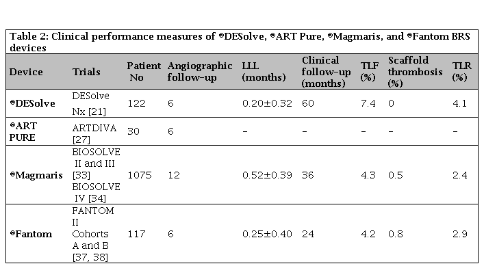 ®ART Pure BRS device consists of a PDLLA polymer backbone with no eluted drug and a strut thickness of 170 µm. This design might confer a rapid degradation of the polymer, rapid endothelial coverage of the device, and potentially reduced risk of late device thrombosis. However, this concept should be confirmed in further studies. To date, only one study (ARTDIVA trial in 30 patients) has been reported with ®ART Pure BRS device. At 6 months follow-up, TLF was 3.3% with no cardiac deaths or myocardial infarctions reported (Table 2) [27].