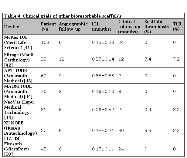 The emergence of bioresorbable scaffold (BRS) started changing the landscape of percutaneous coronary intervention (PCI) and was considered by many the 4th revolution of interventional cardiology. The introduction of drug-eluting stents (DES) have significantly reduced the rates of angiographic restenosis and target lesion revascularization (TLR) compared with bare metal stents (BMS), and second-generation DES have further reduced the rates of stent thrombosis compared with both earlier generation DES and BMS [1]. Current DES are, although, impregnated with sophisticated platforms featuring biocompatible or biodegradable polymers they are not immune to long-term risk of vascular inflammation and stent thrombosis. This drives the impetus for manufacturing and developing BRS. Initial enthusiasm for the applications of BRS in the clinical scenarios has been mitigated by criticism of initial results in the near and long-term. Clinical evidence for BRS has been so far dominated by studies of the ®ABSORB scaffold (Abbott Vascular, Santa Clara, CA, USA), with thousands of patients treated in the setting of clinical registries and randomized trials. Literature on other BRS technologies, including devices available for clinical use is limited. This article reviews the outcomes previous and potentially upcoming BRS, focusing on the most recent stages of clinical development and future directions.