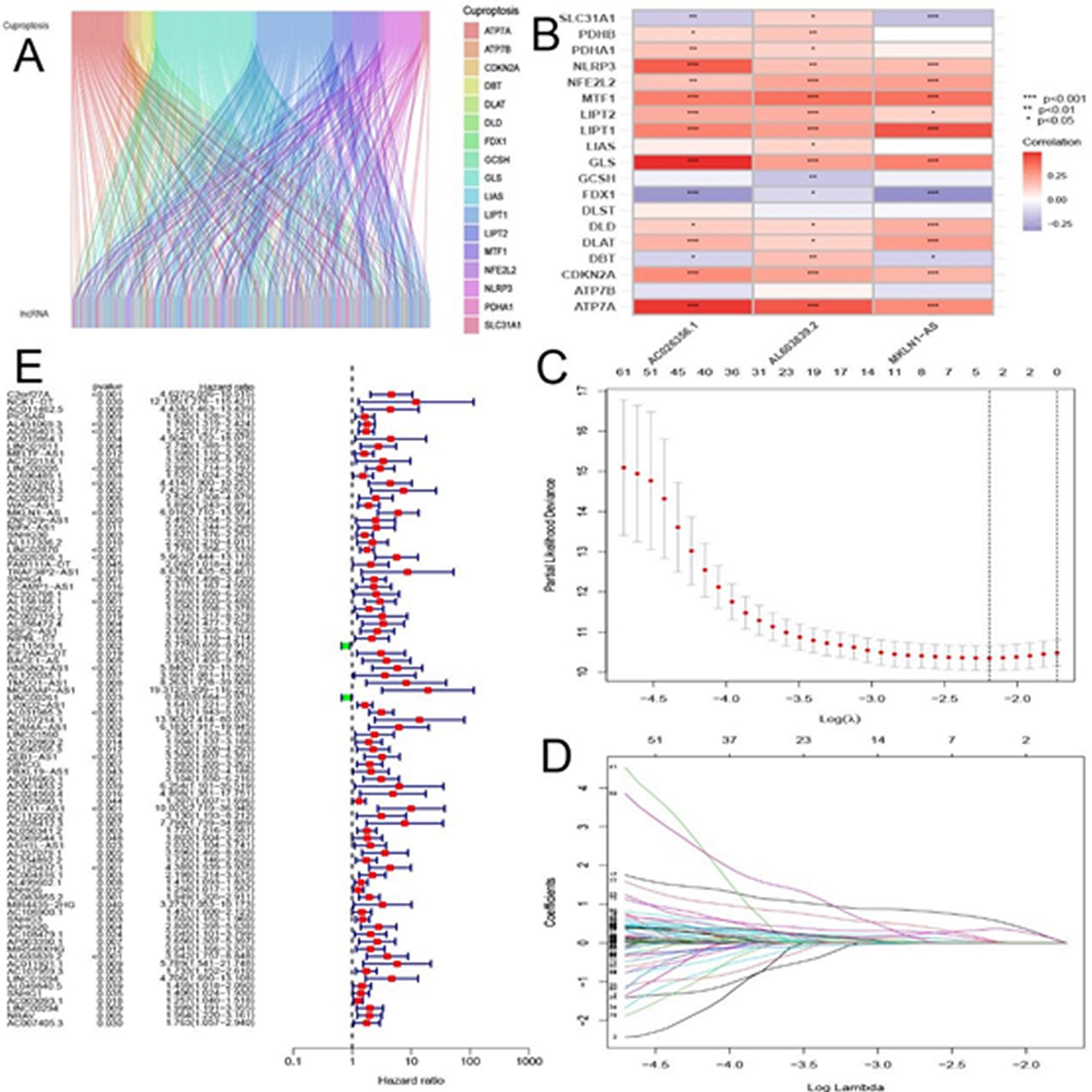 The matrix expression of 19 CuProtosis-related genes and 16,201 LncRNAs was extracted from the TCGA database, and co-expression analysis identified 374 LncRNAs that were co-expressed with CuProtosis. The Sankey diagram of Figure 1A shows LncRNAs that have a co-expression relationship with copper death genes, and the lines between the genes and LncRNAs indicate that the two have a co-expression relationship. Figure 1B is a heat map showing correlations, showing the correlations between 19 copper death genes and 3 copper death-related lncRNAs involved in model construction, with red representing positive correlations and blue representing negative correlations.The genes of CuProtosis-related LncRNAs were merged with clinical data, and the combined data were randomly divided into train group (n=185) and test group (n=185) at a ratio of 1:1, based on CuProtosis-related prognostic genes Lasso regression and construction of COX model, Lasso-penalized Cox analysis is a common method for multiple regression analysis, the application of this method not only improves the prediction accuracy and interpretability of statistical models, but also enables variable options and regularization to be carried out at the same time, which can effectively identify the most available predictive markers and generate prognostic indicators to predict clinical outcomes. Three lncRNAs associated with CuProtosis were selected for subsequent multivariate analysis.