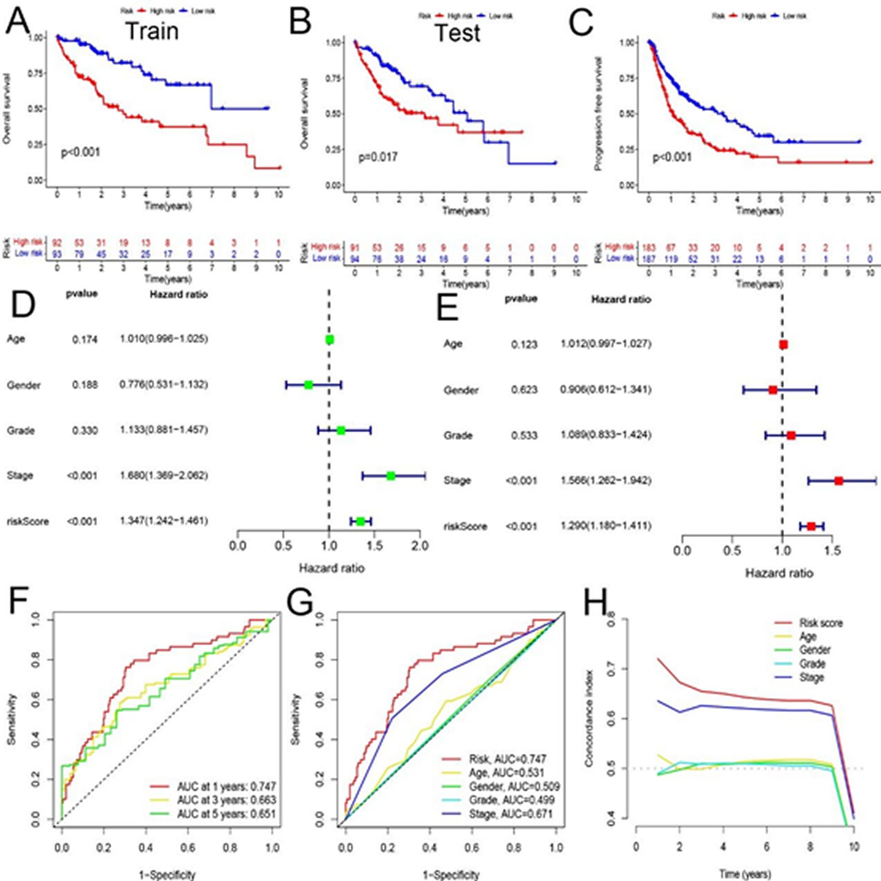 The clinical data between the training and test groups were compared to verify whether there were differences in the data between the two groups. The limma package, reshape2 package, tidyverse package and ggplot2 package in R studio software were used to draw the heat map of LncRAN involved in model construction and CuProtosis, and the pheatmap package was also used to draw the risk curve to observe the difference between high and low risk groups more intuitively. Principal component analysis was performed to verify whether the CuProtosis-related LncRNAs involved in the model construction could distinguish patients in high and low risk groups. Next, survival analysis was performed using the survival package and the survminer package in R studio software to determine whether there was a difference in overall survival and progression-free survival between patients in the high- and low-risk groups. To further validate the model constructed in this study, we performed univariate and multivariate Cox regression analysis to test whether the prognostic model was an independent variable considering other clinical characteristics (sex, age, tumor grade, and tumor stage) of HCC patients. The ROC curve and C-index curve were also drawn to verify the accuracy of the model in predicting the survival of liver cancer patients. In order to verify whether the model constructed in this study is suitable for liver cancer patients in different clinical groups, we also performed model validation of clinical groups.