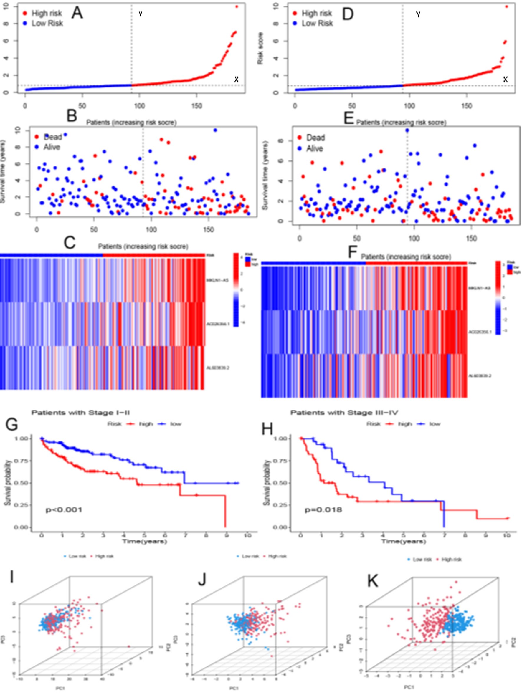 In addition, we calculated the risk scores of the training and testing groups using a unified formula to test the prognostic ability of this model. Figure 3 depicts risk scores, survival status patterns, and risk heatmaps (Figures 3A, 3B, 3C for the training group; Figures 3D, 3E, 3F for the test group), with increasing risk levels from left to right, found MKLN1-AS , AC026356.1 and AL603839.2, the three CuProtosis-related lncRNAs were all high-risk lncRNAs. Finally, to explore whether the model constructed in this study is applicable to different clinical stages, we performed separate analyses of patients with early-stage liver cancer and patients with advanced-stage liver cancer, Figure 3G and Figure 3H, the results showed that Kaplan -Meier survival curves were all statistically significant. Principal component analysis further validated the prognostic model, CuProtosis-related LncRNAs (Figure 3I), CuProtosis-related genes (Figure 3J) showed relatively dispersed distribution of high-risk and low-risk groups, While Figure 3K based on the model we constructed shows that the high-risk group and the low-risk group have different distributions, indicating that the model can distinguish patients in the high-risk and low-risk groups.