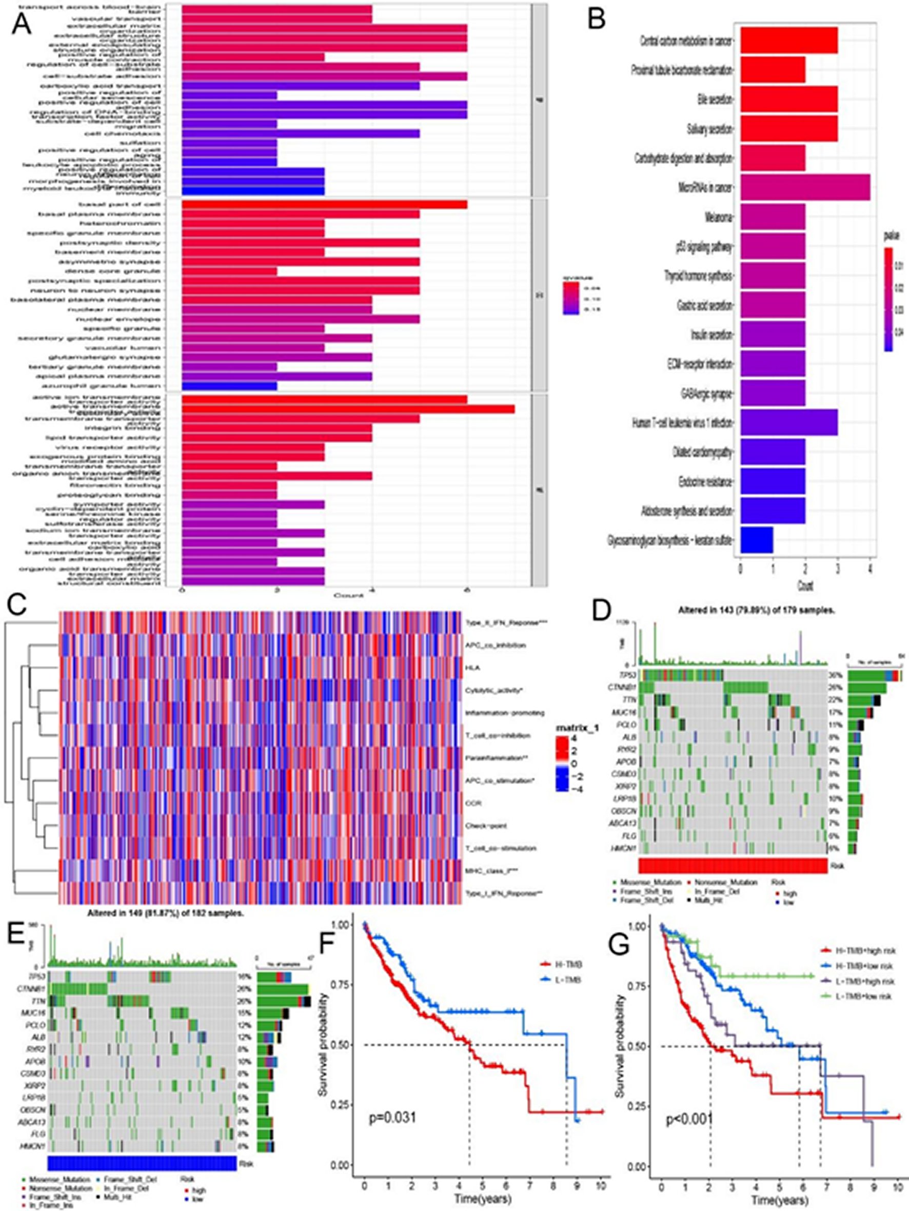 To explore the underlying biological behavior of each subtype, risk differential analysis was performed to find differential genes between high and low risk groups, and a total of 64 differential genes associated with CuProtosis-related subtypes were identified. In Figure 4A, GO enrichment analysis indicated that the differential genes had the most significant differences in the function of active transmembrane transporter activity. In Figure 4B, KEGG enrichment showed that differential genes were mainly enriched in the pathways of MicroRNAs in cancer, Central carbon metabolism in cancer, in bile secretion and salivary secretion. Next, immune function analysis was performed to explore differential immune function in high and low risk groups. In Figure 4C, it was found that the expression of 6 immune functions of Type II IFN Reponse, Cytolytic activity, Parainflammation, APC co-stimulation, MHC class I and Type I IFN Reponse was different between high and low risk groups. There is increasing evidence that patients with high tumor mutational burden (TMB) may benefit more from immunotherapy due to their higher numbers of neoantigens [18, 19, 20]. We analyzed the changes in the distribution of somatic mutations between high- and low-risk groups, and the top five mutated genes in the high- and low-risk groups were TP53, CTNNB1, TTN, MUC16, and PCLO (Figure 4D and Figure 4E). Compared with low-risk patients, high-risk patients had significantly higher frequencies of TP53, CTNNB1, TTN, MUC16, and ALB mutations. In the survival analysis of tumor mutation burden, the survival time of HCC patients in the high and low mutation group was significantly different, and the survival time of the patients in the high mutation group was significantly lower than that of the HCC patients in the low mutation group (Figure 4F). Next, the combined survival analysis of tumor mutational burden and risk score was performed, and the results in Figure 4G showed that patients with high tumor mutational burden and high risk score had the worst survival.