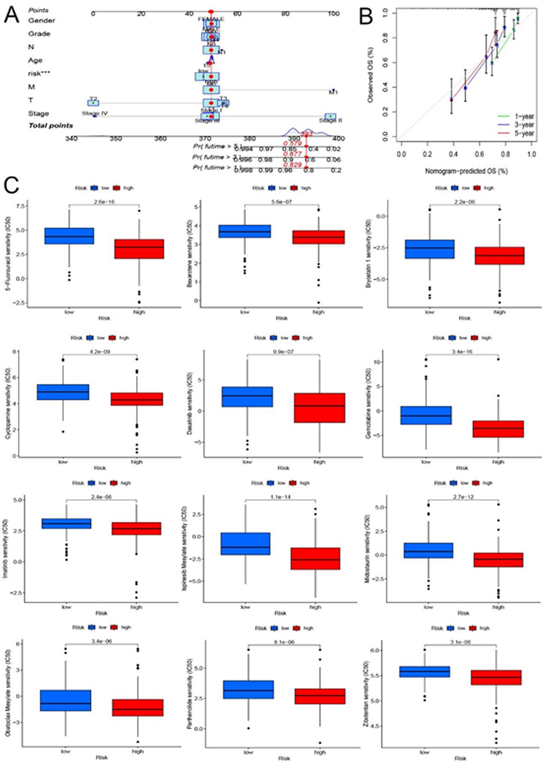 In this study, we built a nomogram including risk scores and clinical parameters to predict survival in patients with HCC 1, 3, and 5 (Figure 5A). It can also be seen from the calibration curve in Figure 5B that the model we constructed has high accuracy in predicting the 1-, 3-, and 5-year survival of patients. Finally, we selected chemotherapeutic drugs currently commonly used to treat tumors to assess the sensitivity of low-risk and high-risk populations to these drugs. Drug names with significant differences in drug sensitivity between high and low risk groups were looked for. In high-risk patients (Figure 5C), IC50 values were significantly lower for 5–Fluorouracil, Bexarotene, Bryostatin, Cyclopamine, Dasatinib, Gemcitabine, Imatinib, Ispinesib Mesylate, Midostaurin, Obatoclax Mesylate, Parthenolide, and Zibotentan.