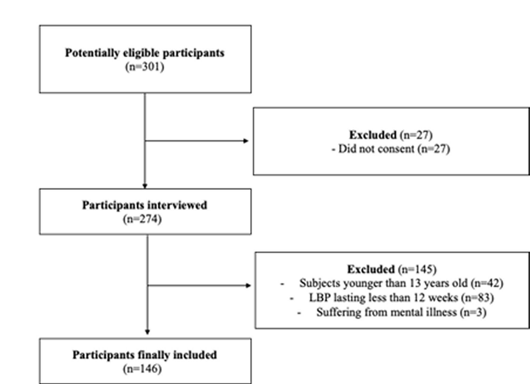 301 potentially eligible participants who matched the target population of this study were identified. 27 subjects did not give their consent to participate in the study, so only 274 were interviewed. After the interview, it was decided to include 145 patients because they were under 13 years of age (n=42), had lumbar pain with a duration of less than 12 weeks (n=83) and for suffering from mental illness (n=3). In total, 146 subjects who met the inclusion criteria were finally included, who underwent an affiliation interview in addition to the psychometric questionnaires (Figure 1).
