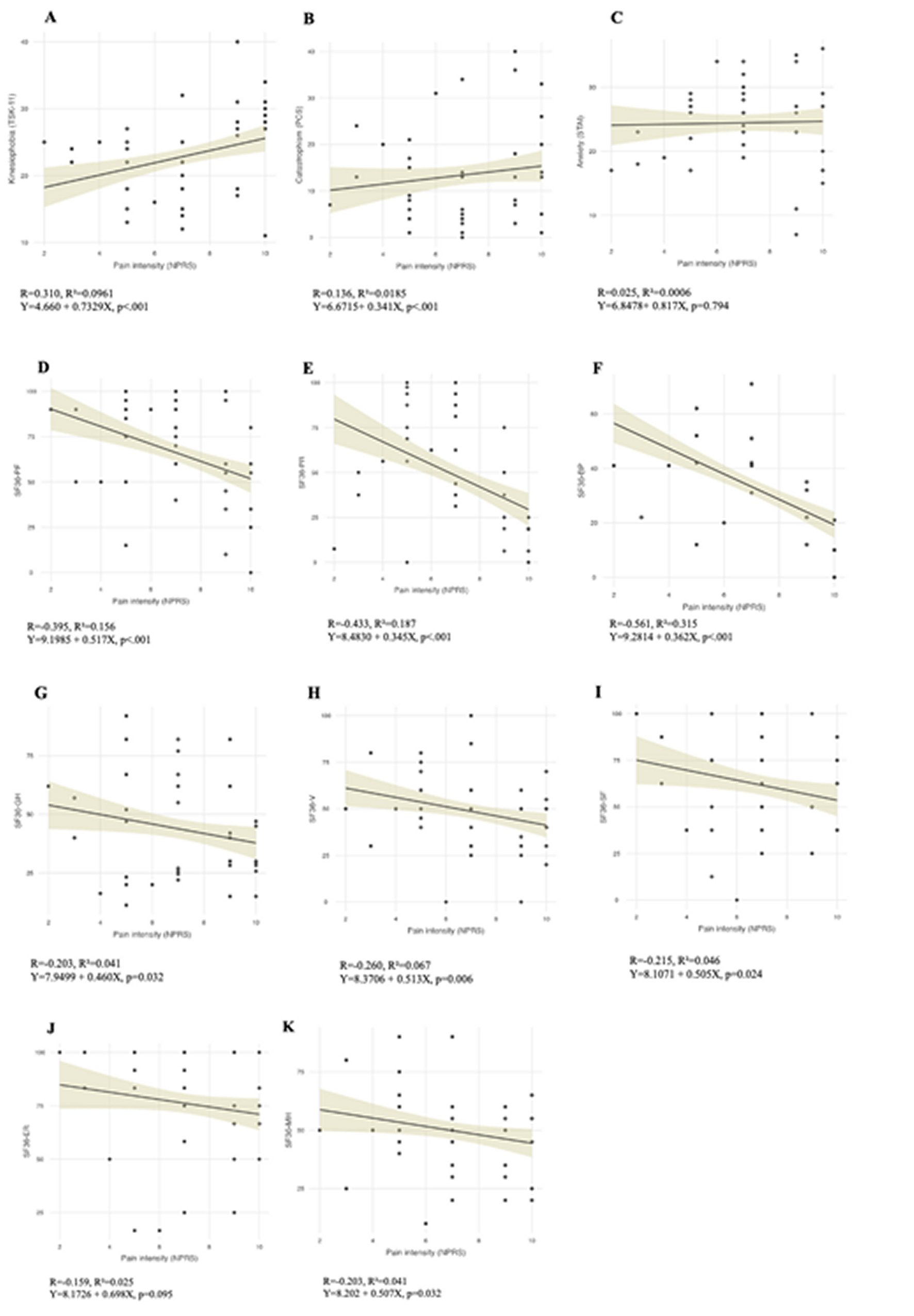 The pain intensity in cLBP patients showed a negative and moderate correlation with SF36-BP score (Pearson’s r= -0.561, p<.001). In addition, negative and weak correlation have found between main variable and SF36-PF (Pearson’s r= -0.395, p<.001), SF36- PR (Pearson’s r=-0.433, p<.001), SF36-V (Pearson’s r=-0.260, p=.006), SF36-GH (Pearson’s r= -0.203, p=.032), SF36-SF (Pearson’s r= - 0.215, p=.024) and SF36-MH (Pearson’s r= - 0.203, p=.032). Furthermore, pain intensity showed positive and weak with kinesiophobia score (Pearson’s r=0.310, p<.001) and positive and very weak with catastrophism (Pearson’s r=0.136, p<.001). In contrast, there was no correlation between pain intensity and anxiety in subjects diagnosed of cLBP (Pearson’s r=0.025, p=0.794) (Table 3, Figure 2).