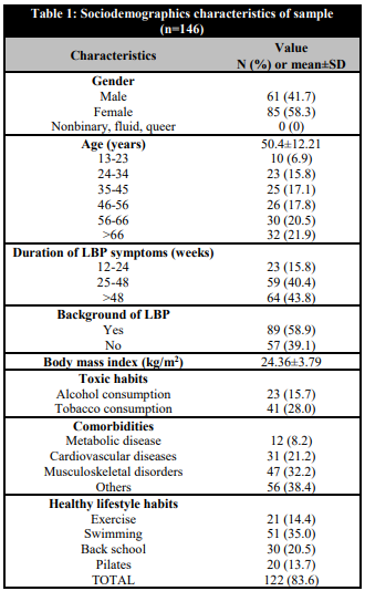 85 women (58.3%) and 61 men (41.7%) were finally included. The mean age of the participants was 50.4 ± 12.21 years, with the group over 66 years being the most numerous (n=32, 21.9%) followed by the group aged between 56 and 66 years (n=30, 20.5%). The mean duration of symptoms related to low back pain was 42 ± 19 weeks, with the largest group (n=64, 43.8%) expressing pain for more than 48 weeks. According to the existence of a family history of spinal disease, almost 50% of the subjects indicated the presence of a family history related to LBP (family history n=89, 58.9%). The body mass index of the selected sample was 24.36 ± 3.79, which could be considered an overweight sample. On the other hand, many recognized the consumption of alcohol (n=23, 15.7%) and tobacco (n=41, 28.0%) in addition to suffering from a set of metabolic diseases (n=12, 8.2%), cardiovascular (n=12, 8.2%), =31, 21.2%) and of musculoskeletal origin (n=47, 32.2%). In addition, most of the participants (n=122, 83.6%) indicated carrying out healthy lifestyle habits to treat or prevent their back injury, among which the majority practice exercise (n=21, 14.4%) and swimming (n=51, 35.0%) (Table 1).