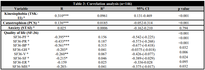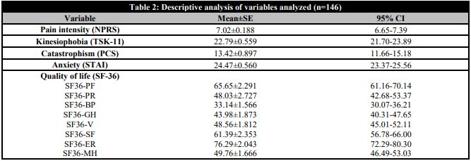 Results: We recruited 146 subjects (n=85 women, 58.3%; n=61 men,41.7%) aged 50.4 ± 12.21 years suffering from cLBP with a moderate pain intensity (7.02±0.188), kinesiophobia (22.79 ± 0.559), catastrophism (13.42 ± 0.897), anxiety (24.47±0.560) and the quality of life SF36-PF (65.65±2.291), SF36-PR (48.03±2.727), SF36-BP (33.14±1.566), SF36-GH (43.98±1.873), SF36-V (48.56±1.812), SF36-SF (61.39±2.353), SF36-ER (76.29±2.043) and SF36-MH (49.76±1.666). Pain intensity in cLBP patients was negatively and moderately correlated with SF36-BP score (Pearson's r = -0.561, p < 0.001). In addition, the main variable was negatively and weakly correlated with SF36-PF (Pearson's r= -0.395, p<.001), SF36-PR (Pearson's r=-0.433, p<.001), SF36-V (Pearson's r = -0.260, p = 0.006), SF36-GH (Pearson's r = -0.203, p=0.032), SF36-SF (Pearson's r=-0.215, p=0.024). and SF36-MH (Pearson's r= -0.203, p = 0.032). Furthermore, pain intensity showed positive and weak with kinesiophobia score (Pearson’s r=0.310, p<.001) and positive and very weak with catastrophism (Pearson’s r=0.136, p<.001). In contrast, there was not correlation between pain intensity and anxiety in cLBP subjects (Pearson’s r=0.025, p=0.794).