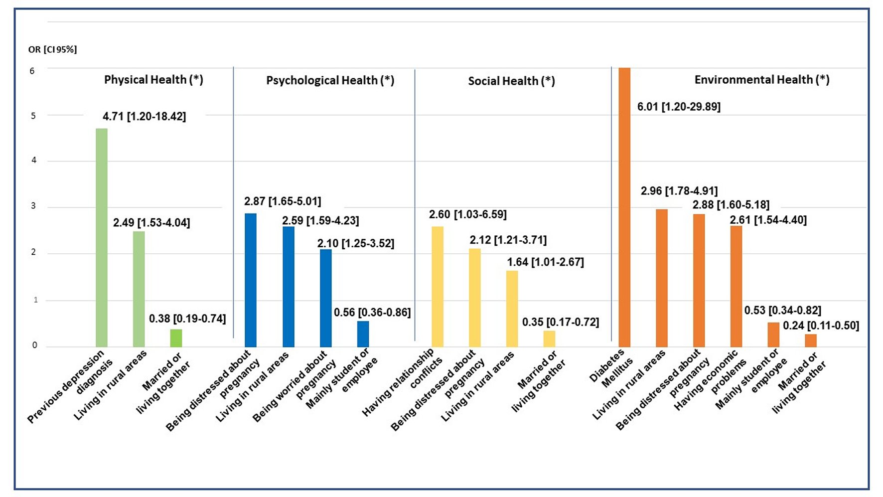 Results: The age of the participants was 26.8 ± 6.2 years. In 250 (49.1%) physical or mental deterioration was identified, in 281 (55.2%) deterioration of the social relationship and in 270 (53.0%) of the environmental relationship. Diabetes OR:6.01[95%CI:1.20-18.42], depression OR:4.71[95%CI:1-20-18.42], living in a rural area OR:2.96[95%CI :1.78-4.91], anguish with pregnancy OR:2.87[95%CI:1.65-5.01], financial problems OR:2.61[95%CI:1.54-4.40 ] or couple OR:2.60[95%CI:1.03-6.69], were associated with impaired quality of life (p<0.01). Being cohabiting, compared to being alone, and being a student/employee versus a housewife, were associated with a lower possibility of deterioration in quality of life (p<0.01).