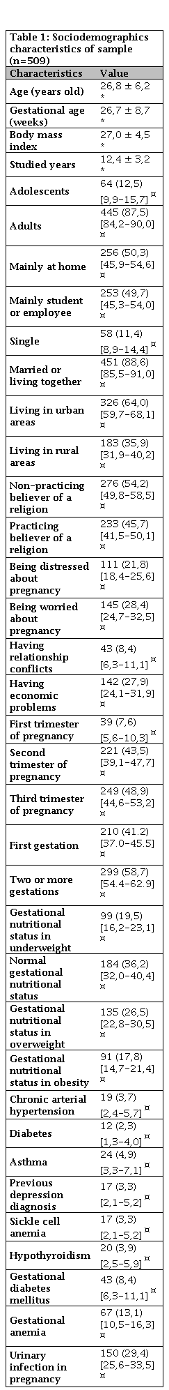 Material and methods: A cross-sectional study was conducted on 509 pregnant women who performed daily activities and participated voluntarily and anonymously after signing informed consent. They filled out a form that explored sociodemographic and clinical characteristics and applied the WHOQOL-BREF scale, identifying the poor quality of life. Adjusted logistic regression was performed to estimate the association between quality of life (dependent variable) and biopsychosocial factors (independent variables).