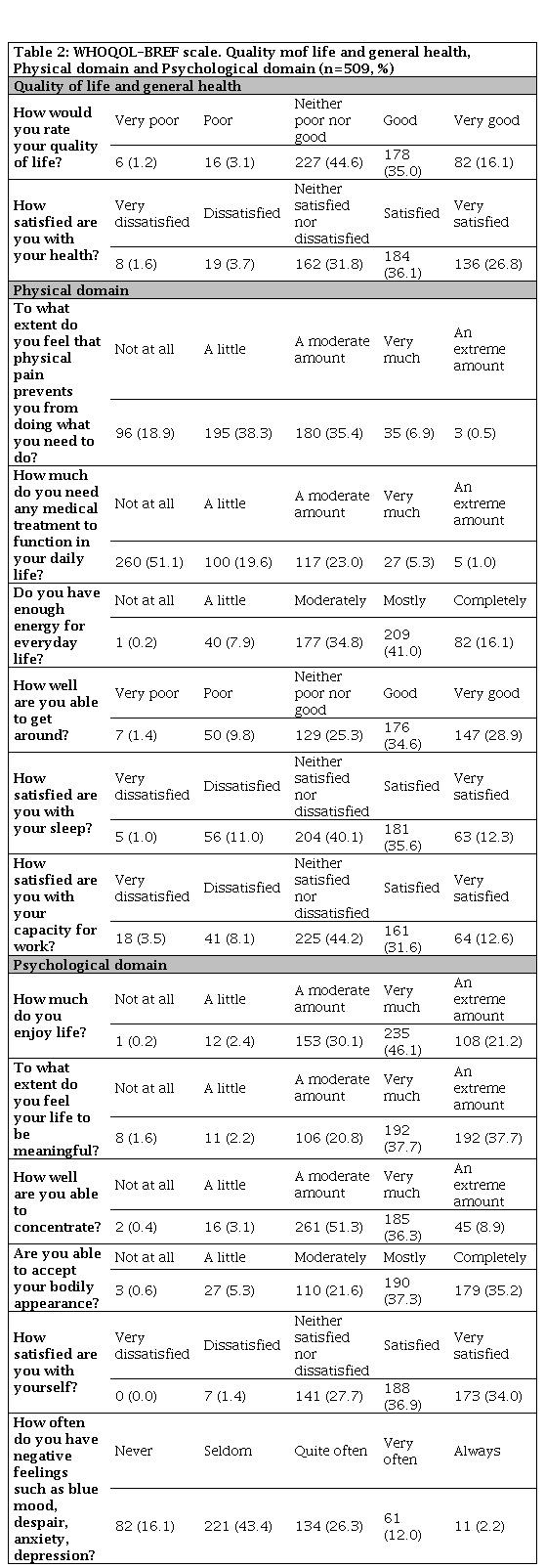 Several instruments are available to assess different spheres of health and measure the quality of life: World Health Organization Quality of Life BREF (WHOQOL-BREF), World Health Organization Quality of Life Questionnaire (WHOQOL-100), Short Form 36 Health Survey Questionnaire (SF-36), Short Form 12 Health Survey Questionnaire (SF-12), Nottingham Health Profile (NHP), Sickness Impact Profile (SIP) [2].