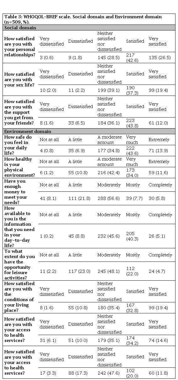 The statistical analysis was performed with Epi Info-7. Continuous variables are expressed as means and standard deviation, and categorical variables as absolute values, percentages, and 95%CI. Four adjusted logistic regression models were performed to estimate the association between the four domains of quality of life (dependent variable) with the sociodemographic and clinical aspects included in the study (independent variables). Associations are presented with OR [95%CI]. A value of p<0.05 was considered statistically significant.