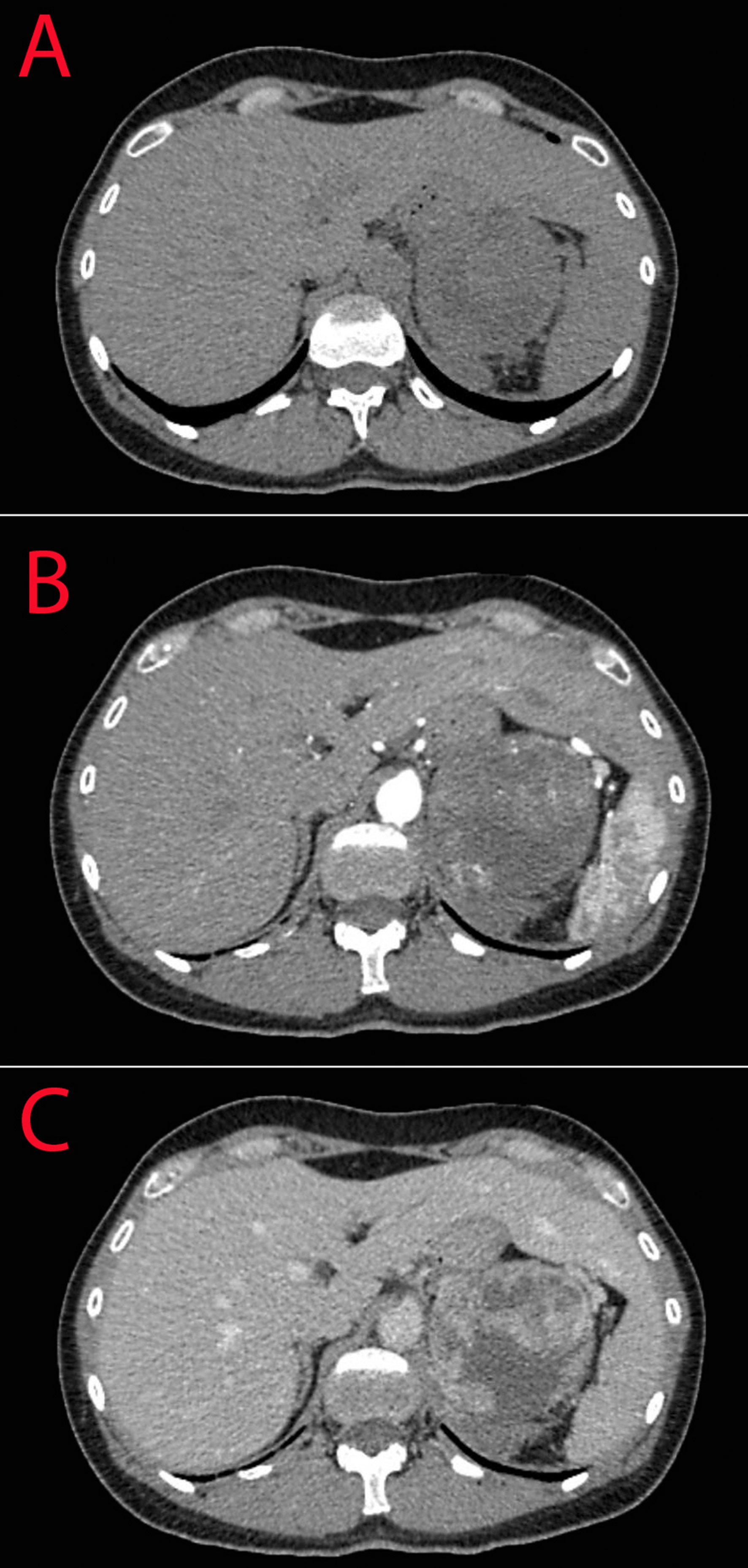 A: Native phase; B: Arterial phase; C: Venous phase.