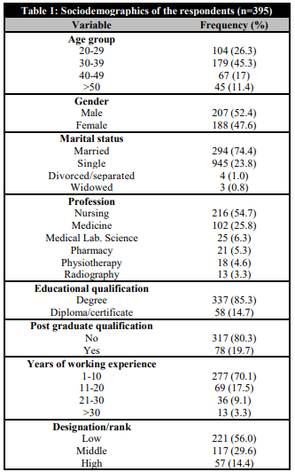 There was a relatively male respondent (52.4%) in this study. This is not confounding, because in Nigeria most health professions from training, apart from nursing, are dominated by males. This male preponderance conforms to the findings from a study by Maduagwu et al. [25]. The male bias in this study might also be linked to socio-cultural and religious factors, which play a major role in the social and public lives of the inhabitants of Northeastern Nigeria where the study site is situated. In this part of Nigeria, most women are saddled with child bearing and upbringing, and are therefore restricted to the four walls of their homes; neither public nor work life is encouraged [29]. Nurses predominated other professions in this study; the reason is not implausible that in most public hospitals in Nigeria, nurses constitute the highest workforce among other health professionals. It may also likely be that the relative short periods of their training at many non-university public health institutions in the country might be a factor.