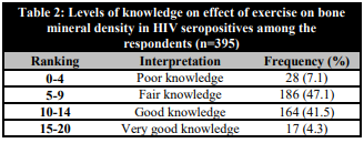 Exercise has been shown to have a favourable effect on BMD in HIV seropositives, yet the findings of this study showed that the respondents had low knowledge about this effect. This low knowledge is worrisome as it beats the expectation of an average health professional regarding the importance of exercise among persons living with HIV. Since there is a low knowledge, this translates to inadequate utilization of exercise as a treatment option in our clime.