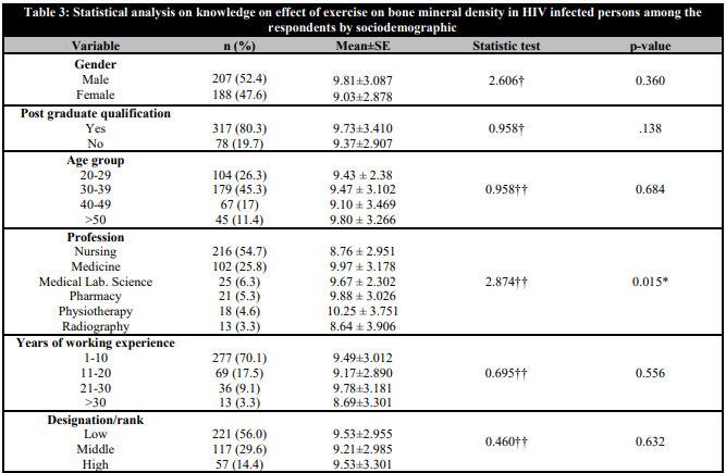 Results: Age range and mean age in years of the respondents were 21–59 and 35.88 ± 9.09 respectively; age group of 30–39 years predominated (45.3%). Males were in preponderance (52.4%), and most (74.4%) were married; while majority (54.7%) were nurses. Substantial proportion (54.2%) had less than good knowledge on the subject examined in this study. Significant difference (p < 0.05; p = 0.015) in knowledge on effect of exercise on BMD in HIV population existed among the professions. Post hoc showed that knowledge of the physicians (p = 0.001) and laboratory scientists (p = 0.029) were significantly higher than that of the nurses. Physiotherapists’ knowledge on this subject compared to that of other health professionals was statistically insignificant (p > 0.05).
