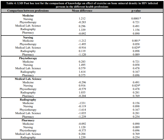 Significant difference (p<0.05; p=0.015) in the knowledge on effect of exercise on BMD in HIV seropositives existed among the health professional groups as illustrated in Table 3. Although the physiotherapists had the highest mean score (10.25 ± 3.751) on the subject as shown in the same table (Table 3); their knowledge was not significant (p>0.05; p= 0.167) when compared with those of the other health professional groups (Table 4). However, the same Table 4 portrays that physicians and laboratory scientists demonstrated significantly higher (p<0.05; p=0,001 and p<0.05; p=0.029 respectively) knowledge on the subject than the nurses.