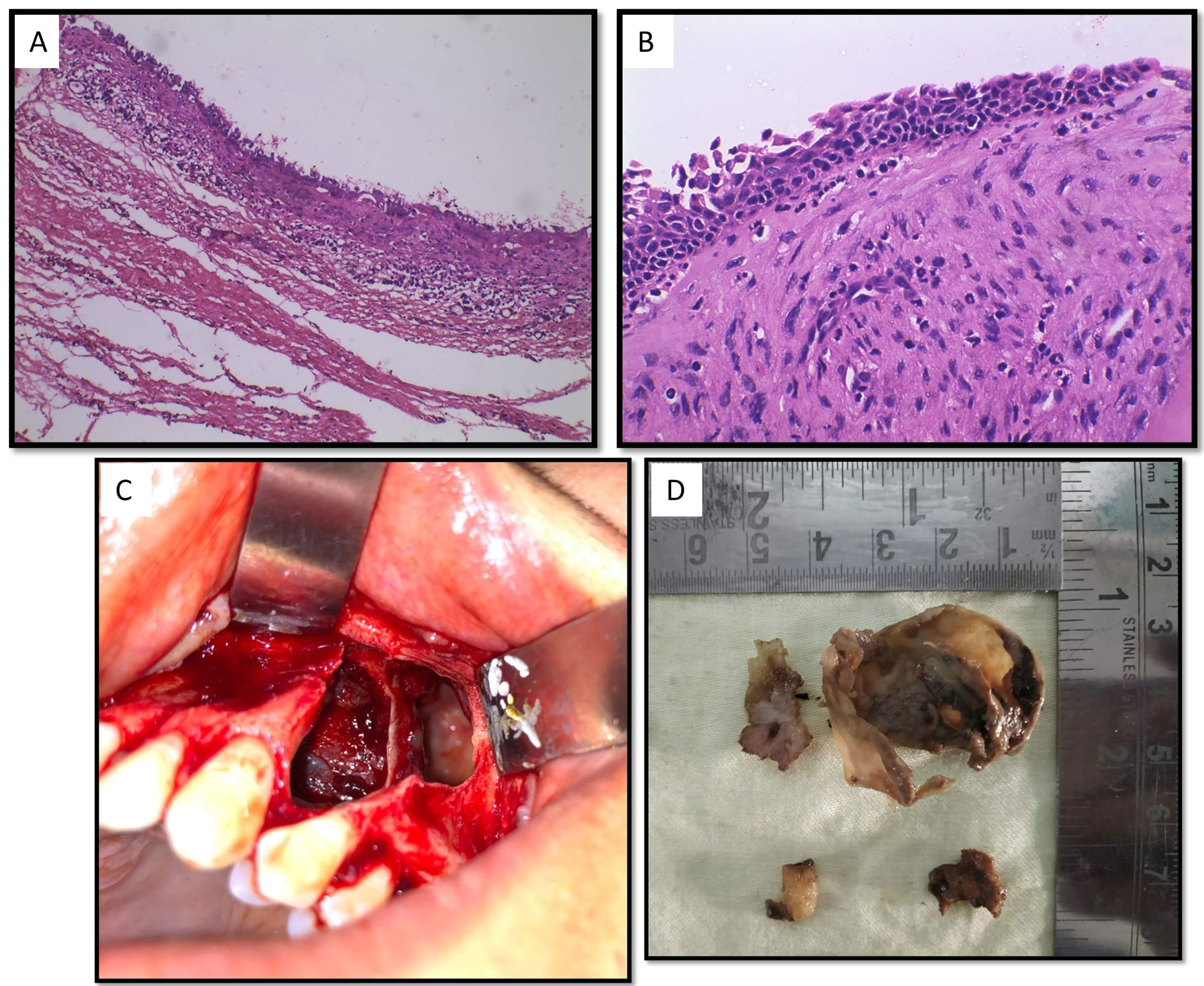 The case was further planned for incisional biopsy under local anaesthesia. Histopathological examination revealed a cystic wall lined by continuous ciliated pseudostratified columnar epithelium. Few areas were showing discontinuous non-keratinized stratified squamous epithelium of 1-2 cell layer thickness, which was continuous with antral lining. Numerous goblet cells and mucus cells were noted in the epithelial lining (Figure 2A and 2B). Excision of the cyst was planned for the patient. An ostectomy was performed using rotary instruments to enlarge the bony cavity. The distinct soft tissue lining was separated from the maxillary sinus lining and excised using curettes (Figure 2C). Sharp margins were rounded off with rotary instruments. Primary closure with 3-0 vicryl suture was achieved. The gross specimen (Figure 2D) was sent for histopathological examination which was consistent with the diagnosis Mucocele of Maxillary Antrum.