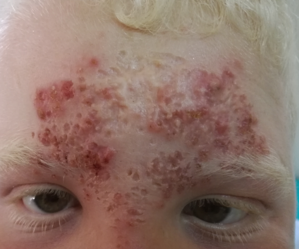 An 11-year-old child boy with an unremarkable medical history apart from albinism was brought to our department for numerous tiny ulcers covering a large part of his forehead and glabella, persistent over the last 3 years despite many cycles of empiric antibiotic treatments. Physical examination revealed multiple asymptomatic, small and superficial ulcers with surrounding erythema and cribriform scars running from his middle forehead until the upper part of the nose (Figure 1). The underlying skin was infiltrated painless. His biochemical parameters were within normal limits, and there were mainly no signs of immunodeficiency syndrome. A history of staying in a leishmaniasis endemic area has been reported, and the diagnosis of CL has been confirmed by detecting Leishmania parasites in tissue specimens from skin ulcers via light-microscopic examination. Treatment by intramuscular injection of pentavalent antimony drugs at 10 mg/kg/day for a period of 15 consecutive days associated with oral prednisone 0.5 mg/kg/day for 5 days resulted in a clear regression and healing of ulcers within one month (Figure 2).