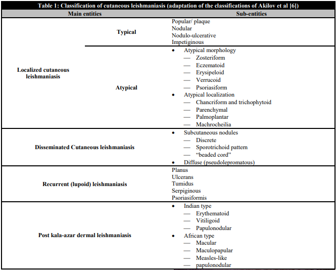 The leishmaniases are considered as a spectrum ranging from benign forms represented by CL to mucocutaneous leishmaniasis and systemic visceral leishmaniasis. Further, CL encompasses other entities including localized CL, disseminated CL, recurrent (lupoid) CL and post Kala azar dermal leishmaniasis (Table 1). Different peculiar lesions of CL have been reported worldwide [4]. They may display various aspects, such as lupoid, eczematous, erysipeloid, verrucous, dry, zosteriform, paronychial, sporotrichoid, chancriform, annular and erythematous volcanic ulcers [5]. Our patient presented a rare, atypical form of CL with a number of superficial tiny ulcers and scars, and the affected area appeared as a “cribriform” plaque. Often, these atypical forms of CL are misdiagnosed as blastomycosis, sporotrichosis, diverse fungal skin infections, cutaneous anthrax, eczema, lepromatous leprosy, tuberculosis, Mycobacterium marinum infections, basal and squamous cell carcinomas, and even infected insect bites [4]; and this would result in delayed diagnosis and treatment, as in our case. The reason for this pleomorphism is still unclear, but it might reflect an underlying immune disturbance; and variations in parasite virulence and host factors have been hypothesized to modulate the CL presentation [4]. Our patient depicts only albinism, which is not an immune deficiency by itself.