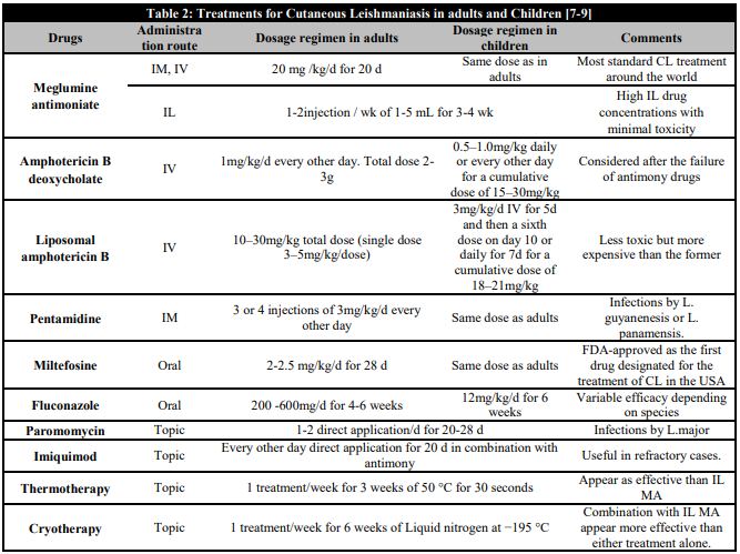 Treatment of CL differs according to infecting species, extent, location and progression of the disease. Usually, for limited infection when one or a few small lesions are present (excluding periorificial areas or over a joint) topical treatment could be proposed as the sole therapy. However, systemic therapy (mainly antimony drugs) should be used for more extensive lesions (Table 2).