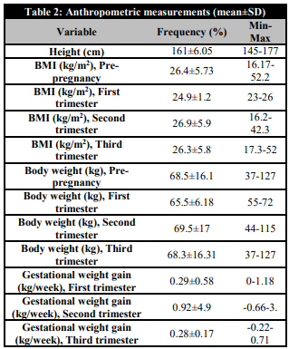 Body weight and height were measured during trimesters. The BMI was calculated by dividing the body weight (kg) by the square of the height (m) and categorizing it as underweight, normal weight, overweight, or obese. Weight gain in the first, second, and third trimesters was recorded [18].