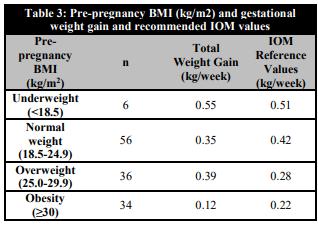 In Yong's study, weekly weight gain was found above the IOM reference values in pregnant women with obesity according to pre-pregnancy BMI [40]. According to pre-pregnancy BMI in our study, this result is similar to the weekly weight gain of overweight pregnant women.