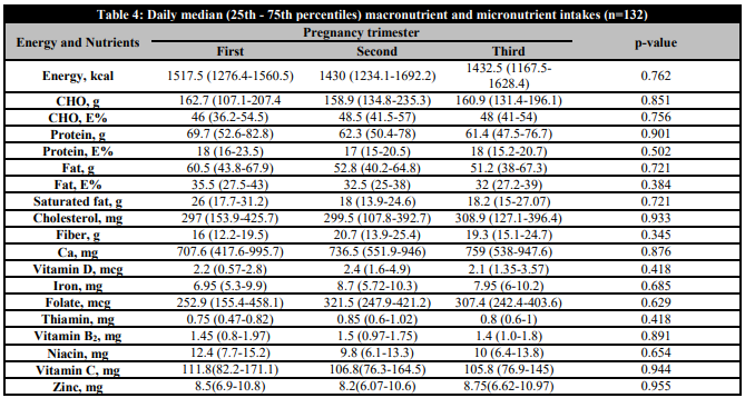 The participants' energy, macro, and micronutrient intakes according to trimesters were given in Table 4. There were no statistically significant differences between the trimesters in energy, macronutrient, and micronutrient intakes. However, diet micronutrient intakes were below the recommendations [17].