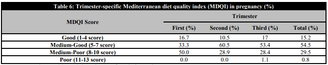 Nutrition during pregnancy is crucial for both the mother's and baby 's health. MD during pregnancy can provide essential nutrients for both the mother and the developing fetus and may reduce the risk of pregnancy complications [8]. The MD has been associated with several health benefits, including reduced excess weight gain during pregnancy and improved health outcomes for both mother and baby [21]. This study used the MDQI to evaluate the Mediterranean-type nutrition model during gestation. Based on the statement, the literature review conducted in our country has yielded limited studies on the subject researched. Our study found that approximately 30% of the pregnant women had poor, 54% had moderate-good, and 15% had good compliance with MD.