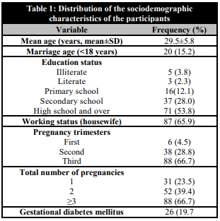 132 pregnant women were included in the study. The mean age of the pregnant women was 29.5±5.8 years and 15.2% of the womans’ marriage age was below 18 years. Of the pregnant women, 28% were below 25, 26.5% were between 26-29, and 45.5% were above 30 years (Table 1).