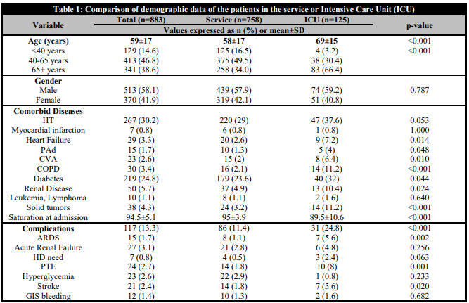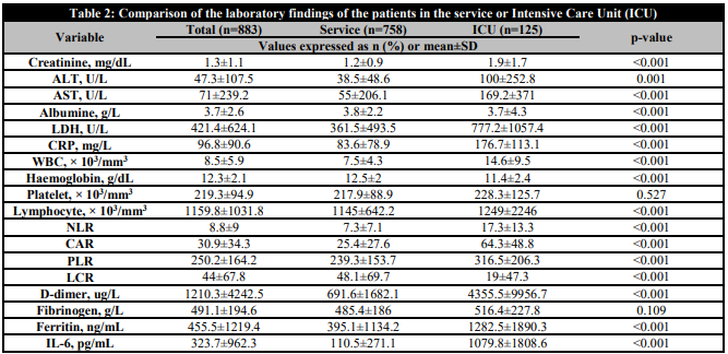 883 patients were evaluated in the study, of whom 758 were patients followed in the ward and 125 in the ICU. The mean age of the patients was 59±17 years, and 58.1% (n=513) were male. The mean age of the patients followed in the ICU was 69±15 years, and ICU admission was significantly higher in patients over 65 years of age. There was no difference in terms of ICU admission according to gender. The most common comorbidities in our patients were hypertension (HT), diabetes mellitus (DM), renal failure and malignancy. Patients with DM, chronic kidney disease, heart failure, peripheral arterial disease (PAH), cerebrovascular accident (CVO), chronic obstructive pulmonary disease (COPD) and solid tumours were more likely to be admitted to the ICU. Patients in the ICU had significantly lower saturations on first admission than those in the service. Patients who developed acute respiratory distress syndrome (ARDS), pulmonary thromboembolism (PTE), and stroke because of COVID-19 complications were significantly more likely to be followed in the ICU (Table 1). Creatinine, ALT, AST, lactate dehydrogenase (LDH), CRP, leukocyte count, lymphocyte count, D-dimer, ferritin, IL-6, neutrophil to lymphocyte ratio (NLR), C-reactive protein to albumin ratio (CAR), platelet to lymphocyte ratio (PLR) were significantly higher in patients followed in the ICU than in those followed in the service (p<0.05). LCR, haemoglobin and albumin levels were significantly lower in ICU patients (p<0.05) (Table 2).