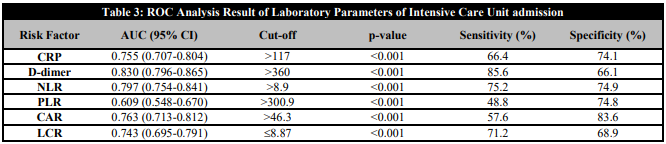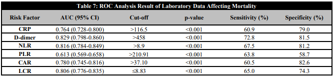 Results: According to the receiver operating characteristic analysis to distinguish the patients followed in the intensive care unit from the patients hospitalized in the ward that was determined that lymphocyte-C-reactive protein ratio, C-reactive protein ratio, CRP-albumin ratio, and neutrophil-lymphocyte ratio were moderate (70%–80%). D-dimer was good (80%–90%) predicting follow-up in intensive care unit. Increase in age, increase in lactate dehydrogenase and interleukin-6 levels, and uptake in tomography were determined as independent risk factors that increase intensive care unit admission. 243 (27.5%) of the patients were mortal. The mean age of the patients with a mortal course was 70±14 years, and mortality increased with increasing age. In the receiver operating characteristic analysis of patients with a mortal course that was determined that lymphocyte-C-reactive protein ratio, neutrophil-lymphocyte ratio, and D-dimer had a good (80–90%) ability to distinguish patients with a mortal course. Age, fever, and increases in lactate dehydrogenase and interleukin-6 levels were determined to be independent risk factors increasing mortality.