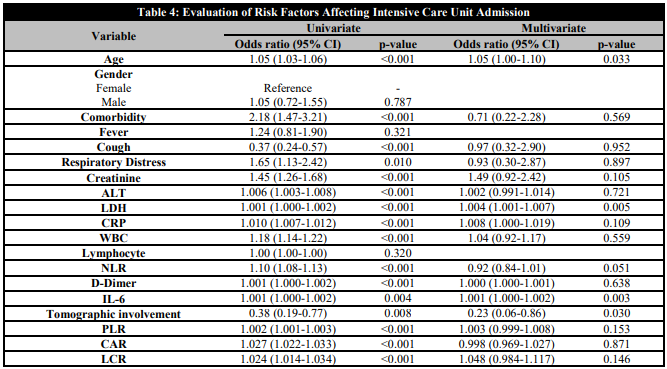 The distribution of risk factors influencing ICU admission of the patients in the study is shown in Table 4. Age, presence of comorbidities, cough, dyspnoea, ALT, LDH, CRP, leukocyte count, D-dimer, IL-6, NLR, PLR and CAR increase and LCR decrease and CT scan uptake were found to increase ICU admission in univariate analysis. The presence of comorbidity in the patients increased ICU admission 2.18 fold, shortness of breath 1.65 fold, and increased creatinine levels 1.45 fold. When the parameters that showed a significant difference in the univariate analysis were re-evaluated in the multivariate analysis, increasing age, increasing LDH, increasing IL-6 levels and uptake on tomography were identified as independent risk factors for increasing ICU admission.
