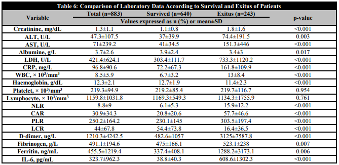 Of the 883 patients included in the study, 640 survived and 243 (27.5%) died. The mean age of patients with a mortal outcome was 70±14 years, and it was observed that mortality increased with increasing age, especially in patients over 65 years of age, mortality was significantly higher than in other age groups (p<0.05). There was no difference in mortality according to sex. Patients with DM, chronic kidney disease (CKD), heart failure, PAH, CVO, COPD and solid tumours had higher mortality. Mortality was significantly higher in patients with low oxygen saturation on hospital admission. Mortality was significantly higher in patients with complications, and mortality was significantly higher in patients who developed acute renal failure, ARDS, PTE, and stroke (Table 5). The levels of creatinine, ALT, AST, LDH, CRP, leukocyte count, D-dimer, fibrinogen, ferritin, IL-6, NLR, CAR, PLR were significantly higher in the patients who survived (p<0.05). LCR, haemoglobin and albumin levels were significantly lower (p<0.05) (Table 6).