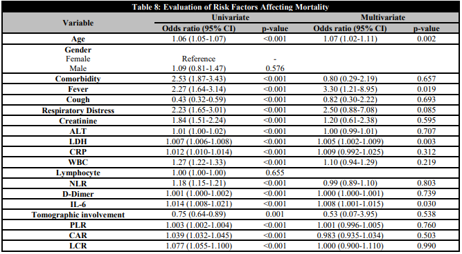 An examination of the risk factors affecting mortality in the patients included in the study is shown in Table 8. In univariate analysis, age, presence of additional diseases, presence of fever, cough and shortness of breath, creatinine, ALT, LDH, CRP, leukocyte count, D-dimer and IL-6 elevation, uptake on tomography, increase in NLR, PLR and CAR, and decrease in LCR were identified as factors increasing mortality. The presence of comorbidity in patients increased mortality 2.53 times, fever 2.27 times, shortness of breath 2.23 times, and the increase in creatinine values 1.45 times. When the parameters that showed a significant difference in univariate analysis were re-evaluated in multivariate analysis, age, fever, increase in LDH and IL-6 levels were identified as independent risk factors increasing mortality.