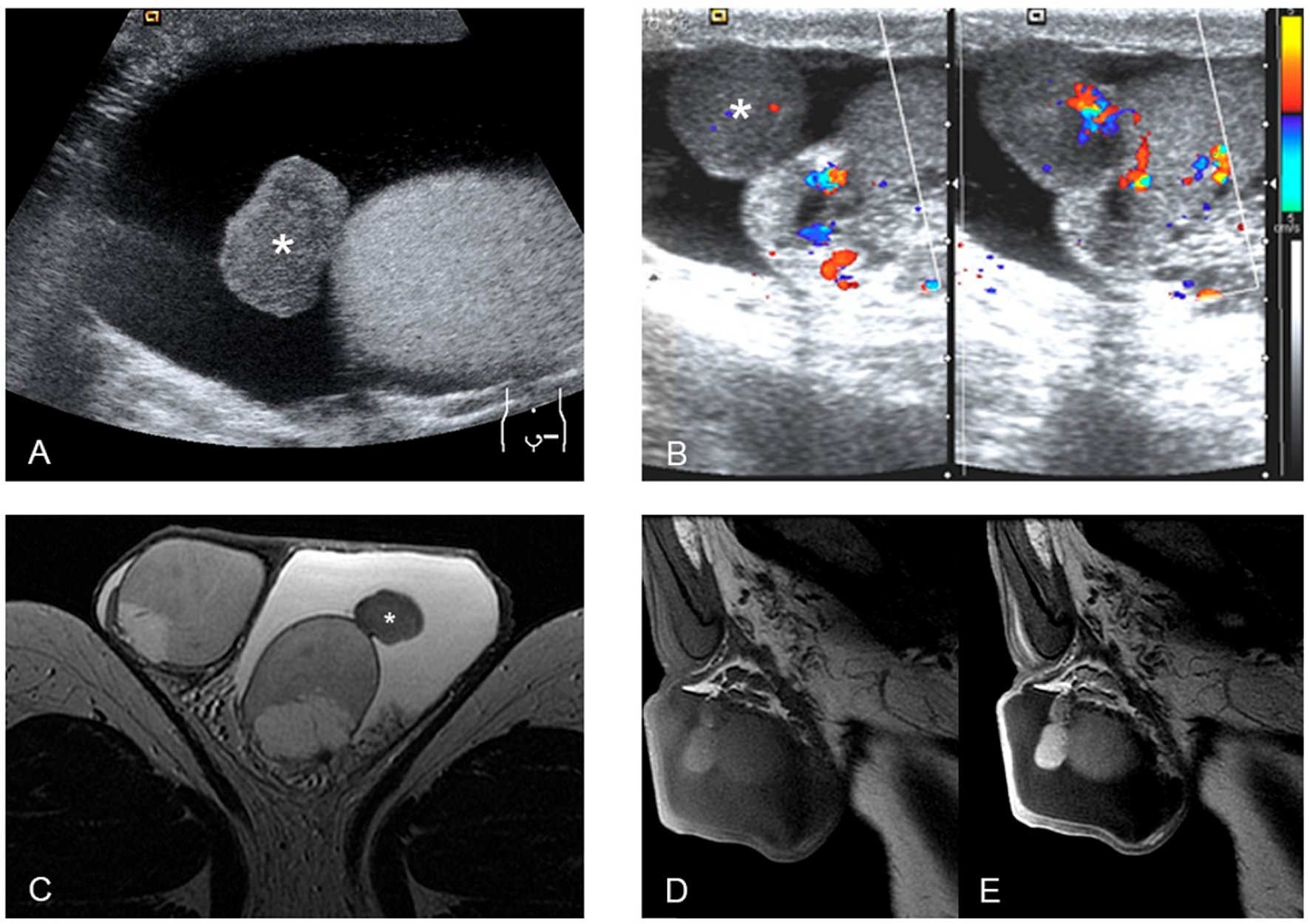 On physical examination, both testicles were of normal size, morphology and structure, but there was a palpable, hard and firm nodular lesion in the upper pole of the left testicle that seemed extra-testicular.