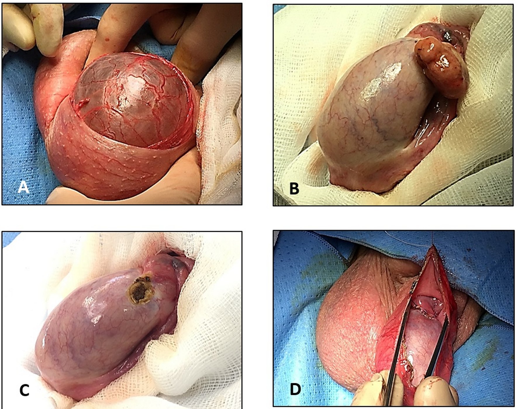 Therefore, because of the increased hydrocele and the high suspicion of benignity, trans-scrotal surgical exploration was decided instead of an inguinal approach as in the malignant masses on which we practice. We performed a para-testicular tumor exeresis and hydrocele drainage without eversion of the tunica vaginalis. A malignant process was not suspected, but just in case, we tried to minimize any oncological risks by preserving anatomical spaces. The hydrocele’s liquid was sent for cytological evaluation. Finally, the tunica vaginalis was sutured, closing the cavity around the testis. During the surgery, it was observed that the tumor was connected to the albuginea tunic of the superior left testicle pole, and the resection was subsequently completed (Figure 2).
