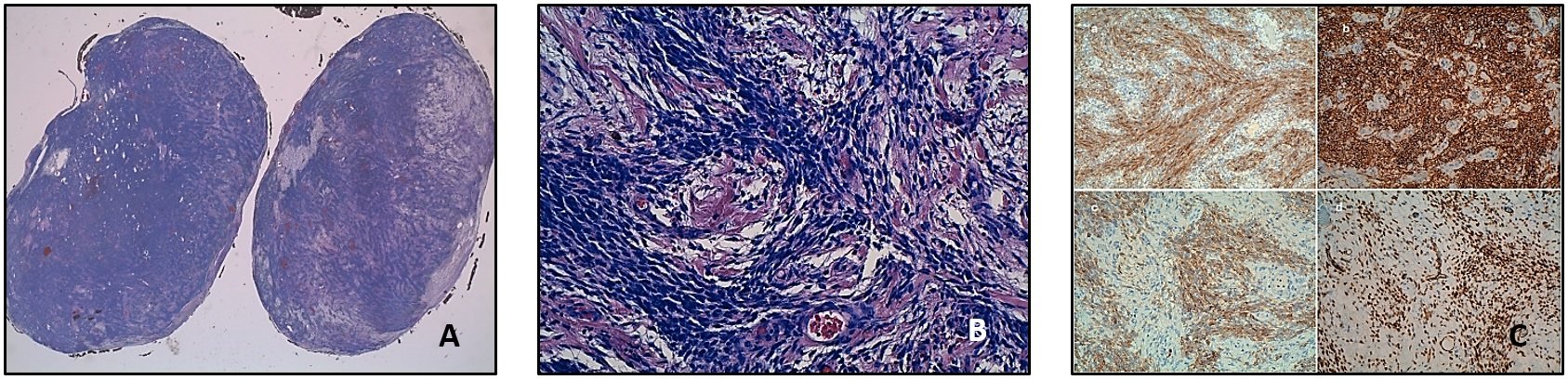 On immunohistochemical analysis, the tumor cells showed a diffuse expression of vimentin, actin, inhibin, calretinin, BCL2, WT1, CD56 and progesterone receptors. There was focal positivity for cytokeratins (AE1-AE3), RE, WT1 and desmin, and negativity for S100, CD31, EMA, CD34 and Caldesmon (Figure 3).